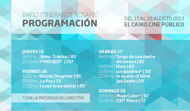 Desde el jueves 15 al domingo 18 se desarrollará en Rosario la 11º edición de la Muestra Itinerante BAFICI en el cine El Cairo (Santa Fe 1120). Esta nueva entrega del festival que trae a la ciudad una selección del material expuesto en Buenos Aires en la 15 º edición, contará con la presencia de directores y productores que presentarán sus trabajos y conversarán con el público presente.